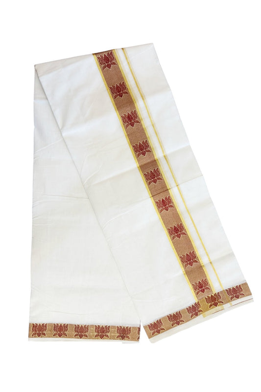 25% DISCOUNT ! KaithariKada HANDLOOM Unakkupaav Balaramapuram - 100% PURE Cotton Pure White Double Mundu/Dhoti - 2 inch Gold Kasavu & Maroon Lotus Jacquard Design Kara - 1KK5190ABH