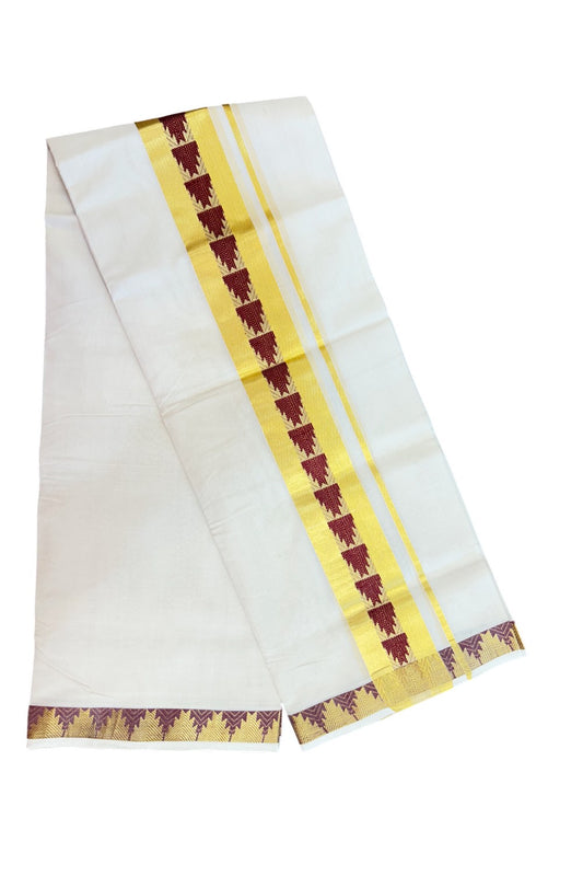 25% Discount ! KaithariKada Handloom Unakkupaav Balaramapuram - 100% Pure Cotton Off White - (Unbleached) Double Mundu/Dhoti - 2.75 inch Gold Kasav & Maroon Temple Jacquard Design Kara - 11KK5208ABH
