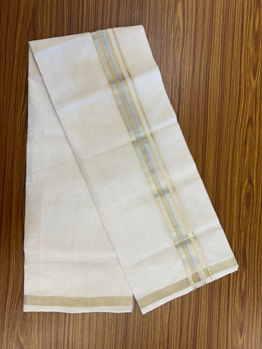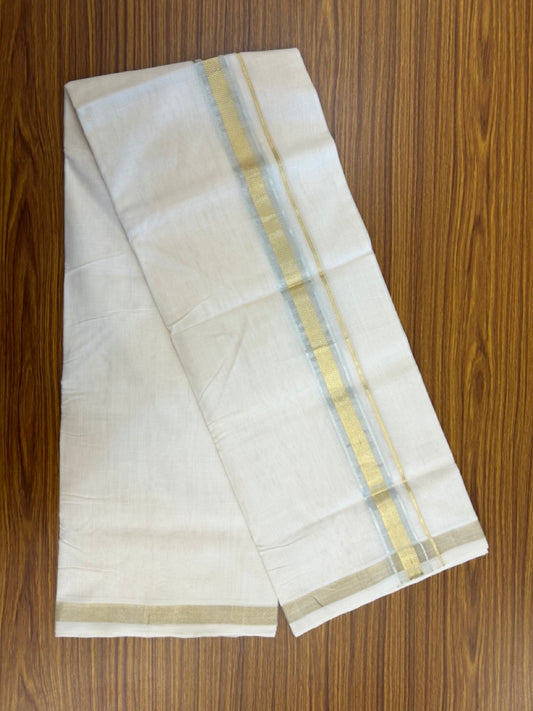 25% DISCOUNT ! KaithariKada HANDLOOM Unakkupaav Balaramapuram - 100% PURE Cotton Off White - (Unbleached) Double Mundu/Dhoti - 3 inch Gold Kasavu & Silver Shaded Striped Design Kara - 9KK5107ABH