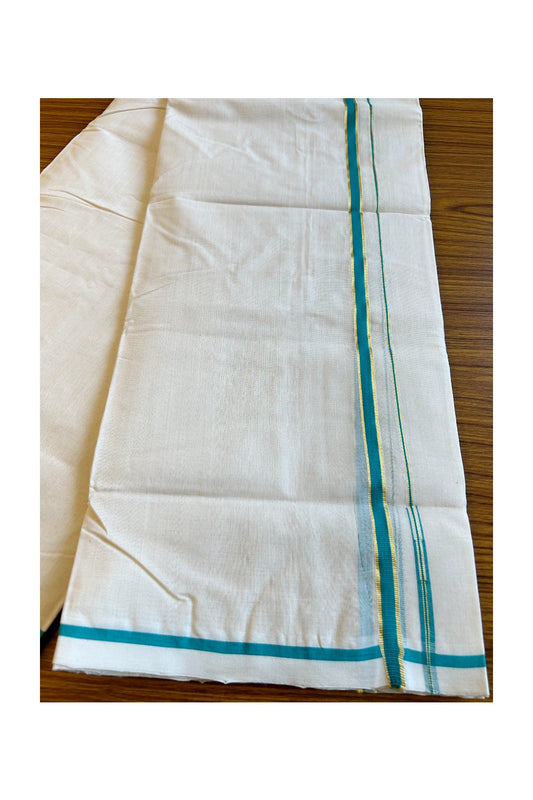 25% Discount KaithariKada Handloom Millpaav Balaramapuram - 100% Pure Cotton off white - (Unbleached) Double Mundu/Dhoti - Puliyilakkara 1.5 cm Kasav & Peacock green Chutty - 37KK456KK