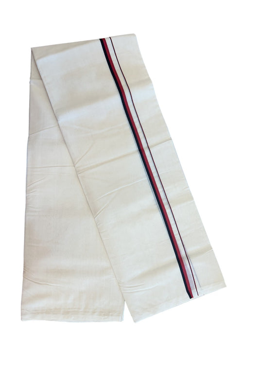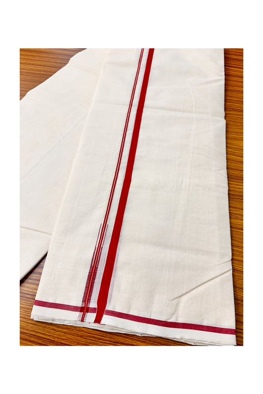 25% DISCOUNT! KaithariKada BALARAMAPURAM HANDLOOM Millpaav- 100% PURE Cotton 100x100 Double Mundu/Dhoti OFF WHITE (Unbleached) - PULIYILAKKARA Maroon+Red 1.cm KARA-3RAM