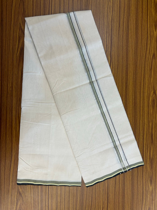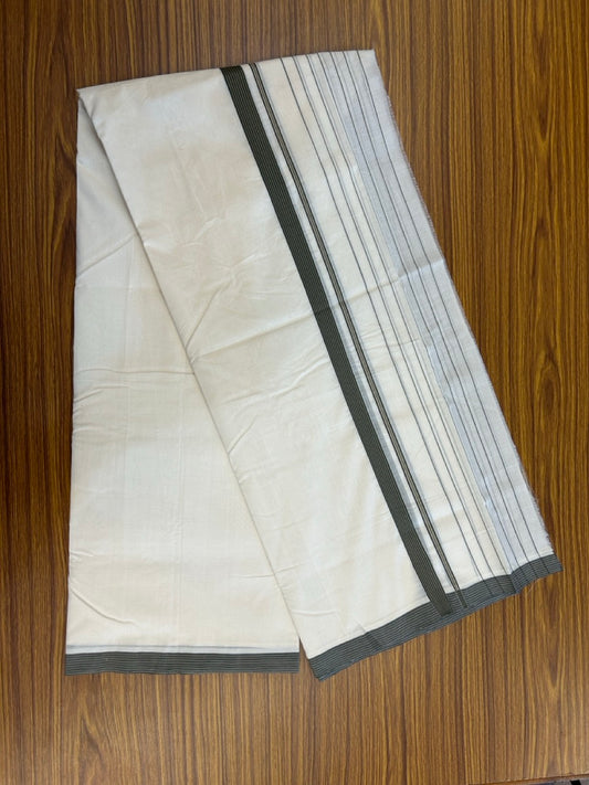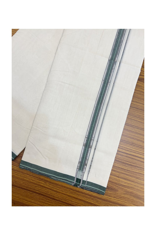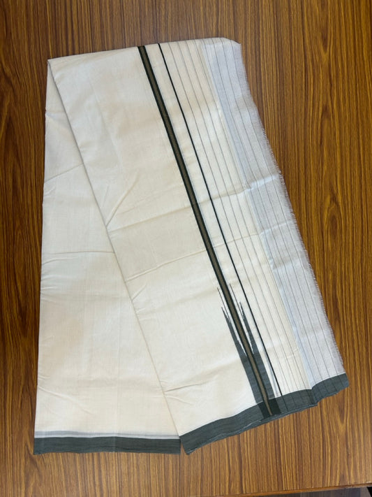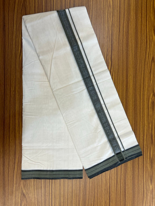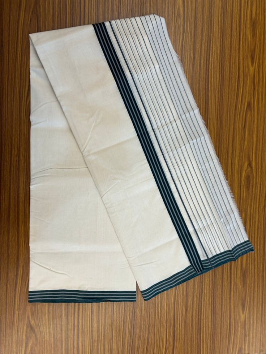 25% Discount!! KaithariKada Handloom Unakkupaav Balaramapuram - 100% Pure Cotton Off White - (Unbleached) Double Mundu/Dothi - 120 x 100 - 0.75 inch Black & Light Green Silver Kasav Striped Kara 4 meter - 11 KK5249 REA