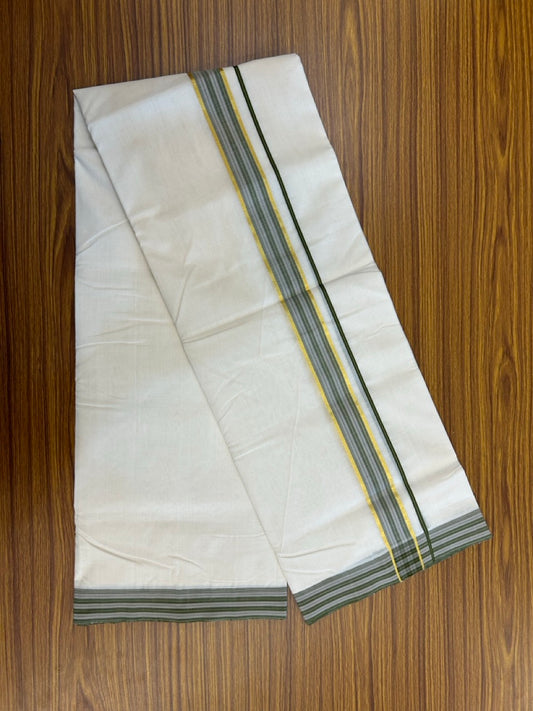 25% Discount!! KaithariKada Handloom Unakkupaav Balaramapuram - 100% Pure Cotton Off White - (Unbleached) Double Mundu/Dothi - 100 x 80 - 1.5 inch Green Ash Stripes Gold Kasav Kara 4 meter - 18 KK5249 REA