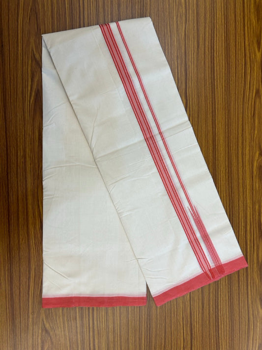 25% Discount!! KaithariKada Handloom Unakkupaav Balaramapuram - 100% Pure Cotton Off White - (Unbleached) Double Mundu/Dothi - 100 x 80 - 0.75 inch Pink Red Chutty Kara 3.85 meter (8.5 mulam) - 8 KK5249 REA