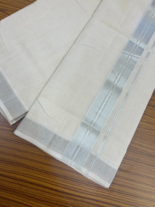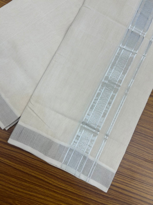 25% Discount!! KaithariKada Handloom Millpaav Balaramapuram - 100% Pure Cotton Off White (Unbleached) Double Mundu/Dhoti - 80x90 - 2 inch Silver Kasav striped Kara 4 Meters (8.5 Muzham) - 4 KK5264 RAM