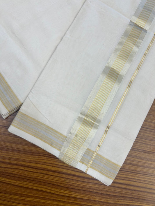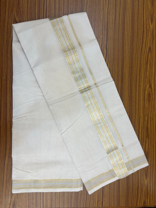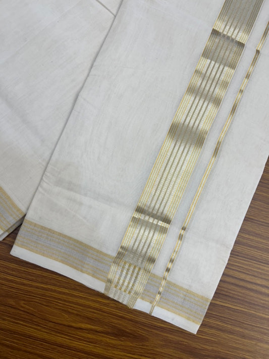 25% Discount!! KaithariKada Handloom Millpaav Balaramapuram - 100% Pure Cotton Off White (Unbleached) Double Mundu/Dhoti - 80x90 - 2 inch Silver & Gold Kasav striped Kara 4 Meters (8.5 Muzham) - 6 KK5264 RAM