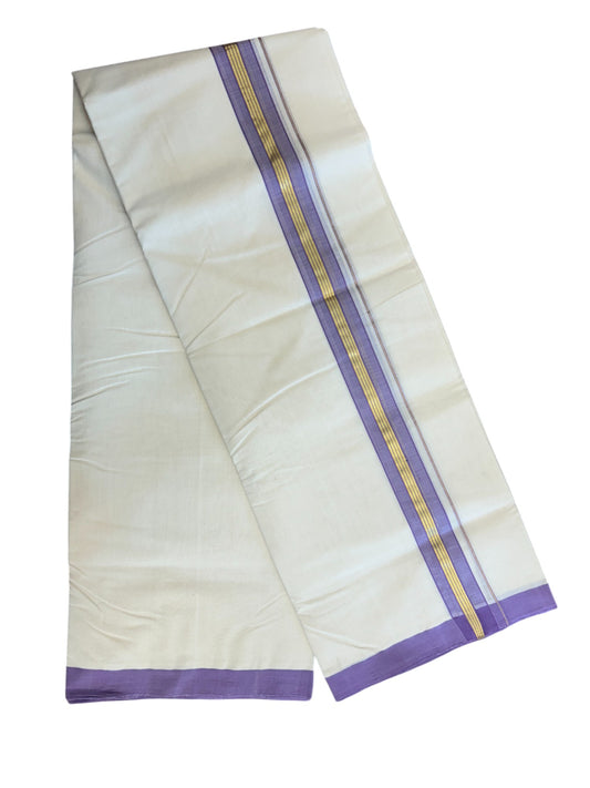 25% DISCOUNT!! KaithariKada HANDLOOM Millpaav Balaramapuram - 100% PURE Cotton OFF White Double - (Unbleached) Mundu/Dothi - 1.75 Inch Gold Kasav Violet kara - 11KK5153RAM