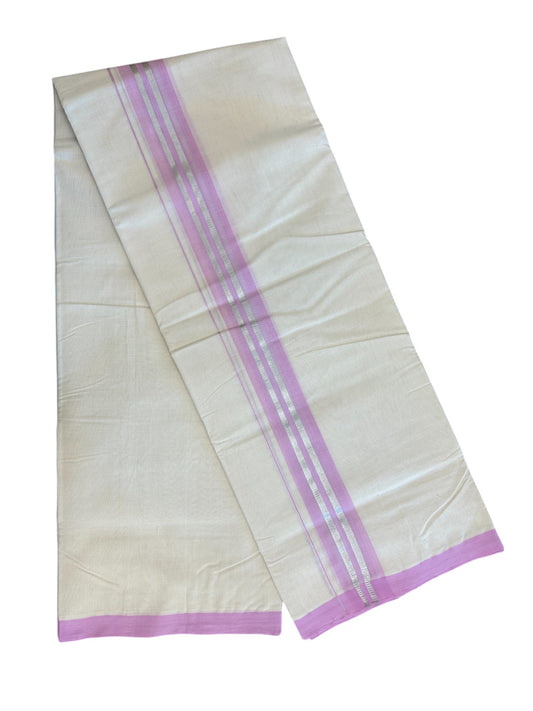 25% DISCOUNT!! KaithariKada HANDLOOM Millpaav Balaramapuram - 100% PURE Cotton OFF White Double - (Unbleached) Mundu/Dothi - 1.75 Inch Silver Kasav Purple Pink kara - 22KK5153RAM