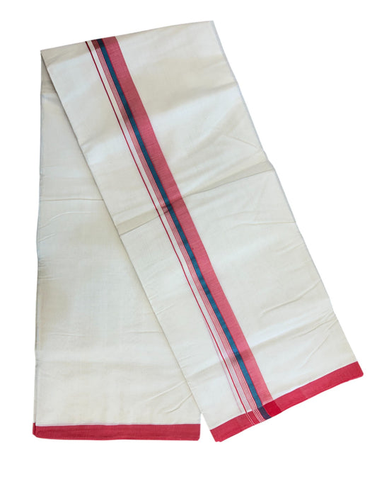 25% DISCOUNT!! KaithariKada HANDLOOM Millpaav Balaramapuram - 100% PURE Cotton OFF White Double - (Unbleached) Mundu/Dothi - 1.75 Inch Gold Peacock Blue Kasav Red kara - 16KK5153RAM