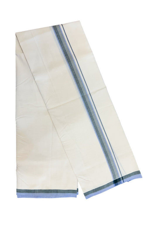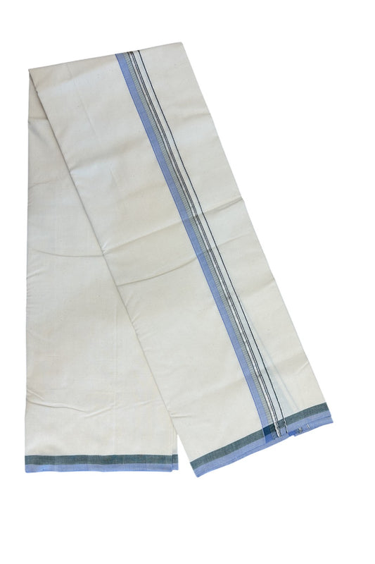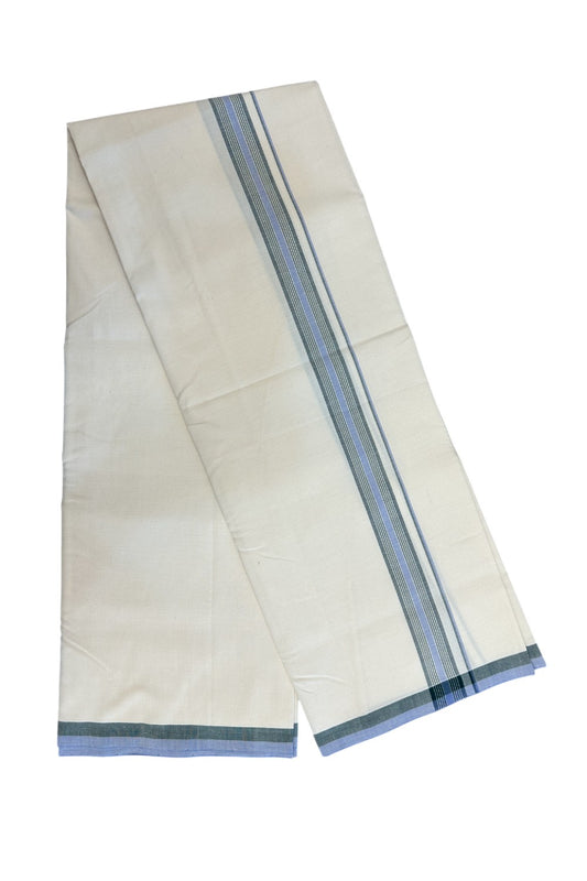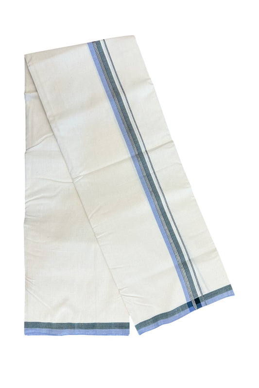 25%DISCOUNT!! SIGNATURE KAITHARIKADA EXCLUSIVE SINGLE DHOTI - 100% Cotton Balaramapuram HANDLOOM Single Mundu/Dhoti - Off White - (Unbleached) 1 inch Green Lavender & Silver Kasavu Striped Kara (2 meter / 4 muzham)- 12KK5173KAI