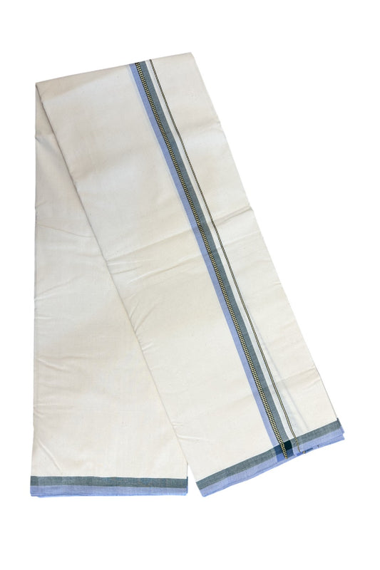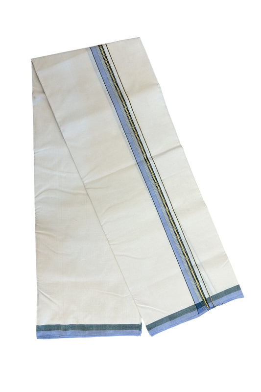 25%DISCOUNT!! SIGNATURE KAITHARIKADA EXCLUSIVE SINGLE DHOTI - 100% Cotton Balaramapuram HANDLOOM Single Mundu/Dhoti - Off White - (Unbleached) 1 inch Green Lavender & Gold Kasavu Kara (2 meter / 4 muzham)- 7KK5173KAI