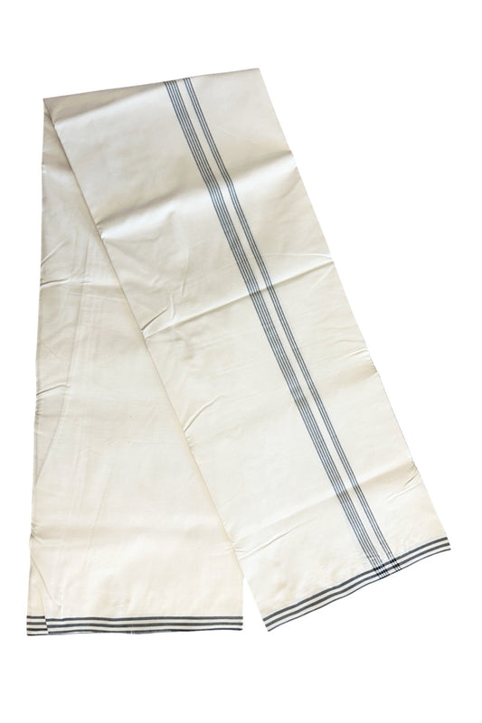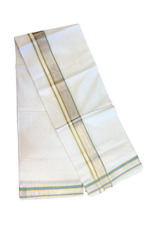 17% Discount! KaithariKada Balaramapuram 100% Cotton Double Pure White Mundu/Dhoti - 100x100 - 1.5 inch Sky Blue Silver Kasav & Gold Kasav Stripes Kara - 7KK5221 GAN