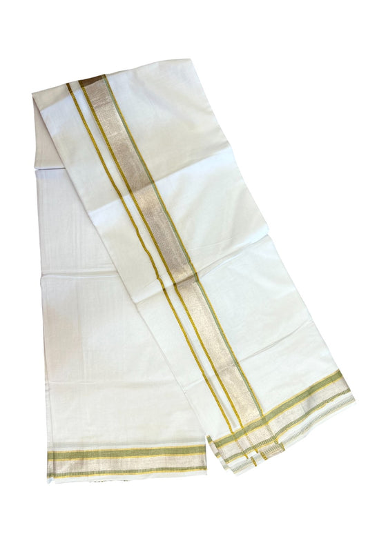 17% Discount! KaithariKada Balaramapuram 100% Cotton Double Pure White Mundu/Dhoti - 100x100 - 1.5 inch Sage Green Silver Kasav & Gold Kasav Stripes Kara - 9KK5221 GAN