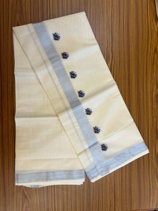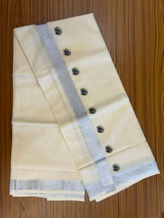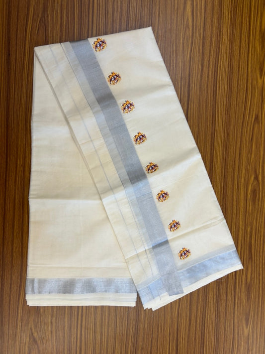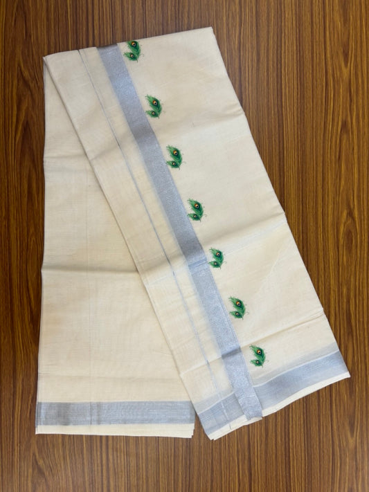 18% Discount !! KaithariKada Balaramapuram 1 Off white (Unbleached) Mundu/Dhoti-Miixed Cotton (80x72) - Hand Painted Silver Kasav Peacock feather Design 2.5 inch Kara 4 mtr (8.5 muzham) - 95 KK5251 PMC