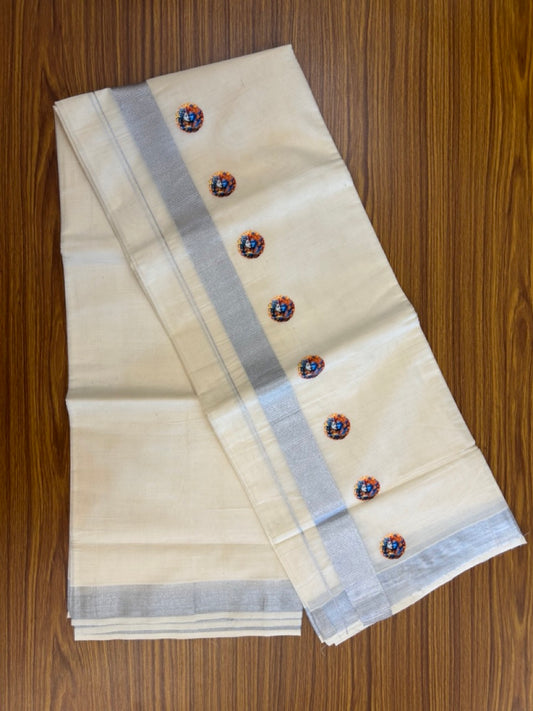 18% Discount !! KaithariKada Balaramapuram Double Off white (Unbleached) Mundu/Dhoti- Mixed Cotton (80x72) - Hand Painted 3 inch Radha Krishna Silver Kasav Orange & Blue Design Kara 4 mtr (8.5 muzham) - 101 KK5251 PMC