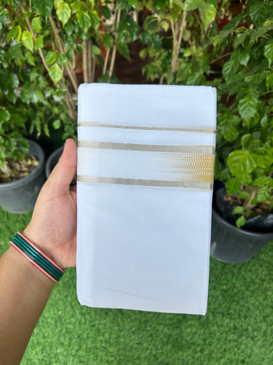 30% Discount! KaithariKada Handloom Millpaav Balaramapuram - 100% Pure Cotton Off White (Unbleached) - 100x100 Double Mundu/Dhoti - 2 inch Gold & Silver Kasavu Peacock green Stripes Kara-81