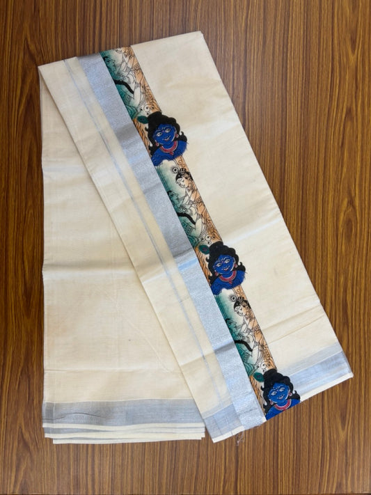 18% Discount! KaithariKada Balaramapuram Off White Double - (Unbleached) Mundu/Dhoti - Mixed Cotton (80x72) - Radha Krishna Hand Printed Silver Kasav Multi colour Pattern 2.75 inch Kara - 92 KK5251 PMC