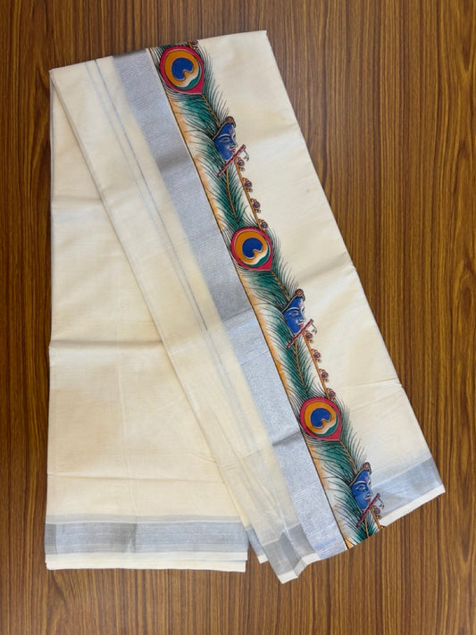 18% Discount! KaithariKada Balaramapuram Off White Double - (Unbleached) Mundu/Dhoti - Mixed Cotton (80x72) - Krishna & Peacock Feather Hand Printed Silver Kasav Multi colour Pattern 3.5 inch Kara - 93 KK5251 PMC