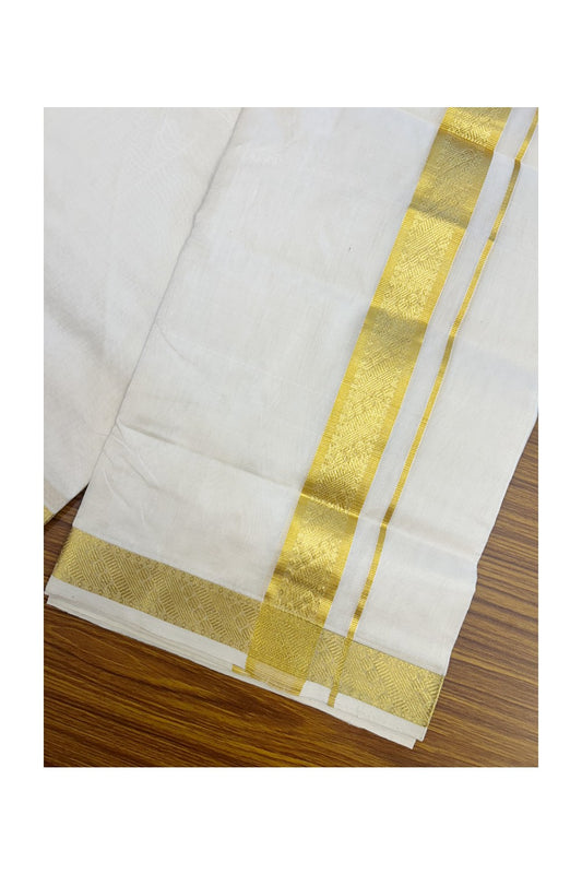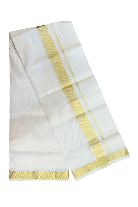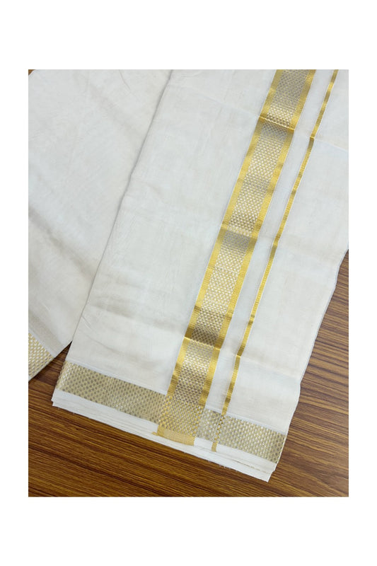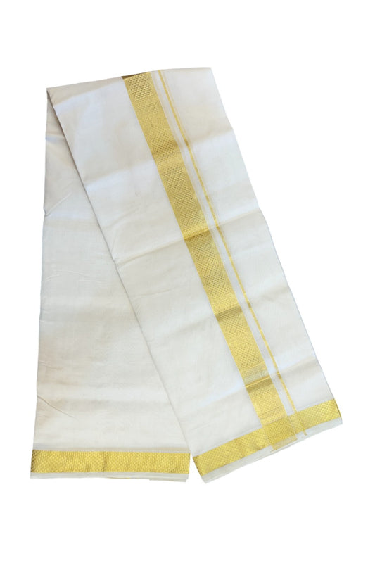 HANDLOOM Pure SILK Dhoti NEW! 25% DISCOUNT from Kaitharikada.com - BALARAMAPURAM Handloom Unakkupaav - OFF WHITE - Double Mundu/Dhoti - 100x100 - Pure cotton + Silk - 1.75 inch Gold Kasavu Designer Kara - 10KK5176ABH