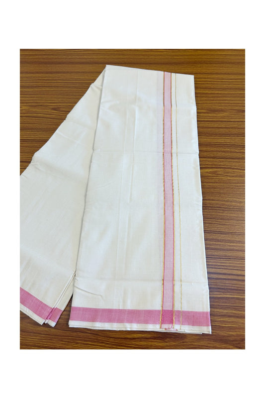 KaithariKada 100% Cotton Balaramapuram Handloom Single Mundu/Dhoti - Off White (Unbleached) 1.45 inch Kasavu & Pink striped Kara (2 meter / 4 muzham) - 10KK499KK.