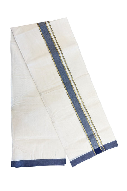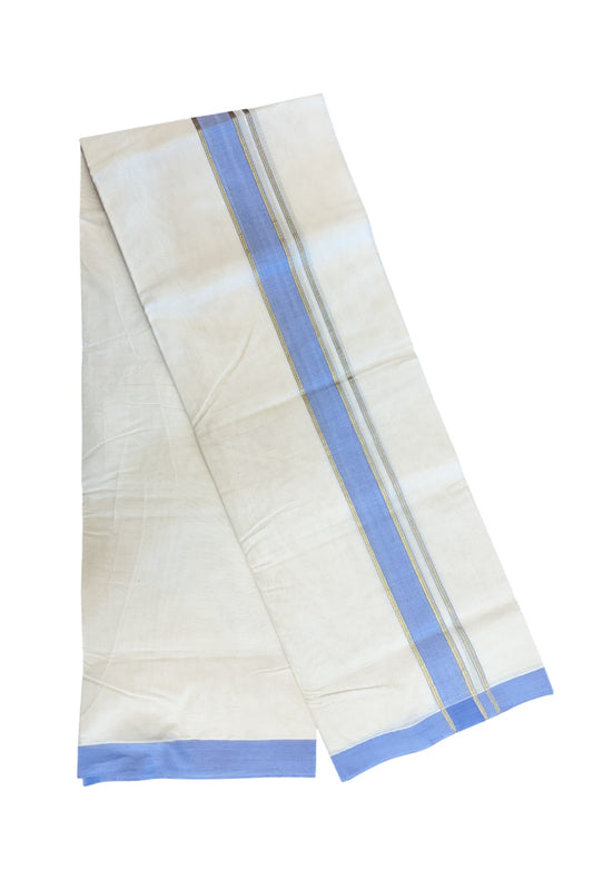New !! 20% Discount!! KaithariKada Balaramapuram 100% Cotton Double Off white - (Unbleached) Mundu/Dhoti-100x80 - 1.5 inch Gold Kasav & Blue Shaded Striped KARA - 3.75 mtr (8 Muzham) - 14KK5218 ASH