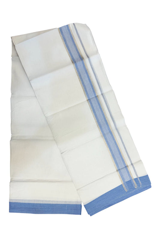 Linen Dhoti NEW! 20% Discount from Kaitharikada.com - Double Mundu/Dhoti 80x90 Thread PURE WHITE - Pure Cotton + Linen -1.5 Inch Sky Blue & Silver Striped Kara - 30KK5174THI