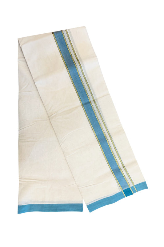 New !! 20% Discount!! KaithariKada Balaramapuram 100% Cotton Double Off white - (Unbleached) Mundu/Dhoti-100x80 - 1.5 inch Gold Kasav & Peacock Blue Shaded Striped KARA - 3.75 mtr (8 Muzham) - 9KK5218 ASH