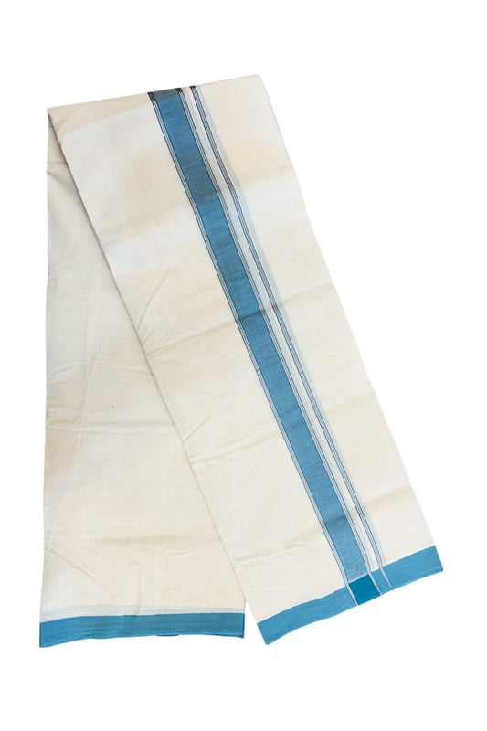 New !! 20% Discount!! KaithariKada Balaramapuram 100% Cotton Double Off white - (Unbleached) Mundu/Dhoti-100x80 - 1.5 inch Silver Kasav & Teal Blue Shaded Striped KARA - 3.75 mtr (8 Muzham) - 16KK5218 ASH