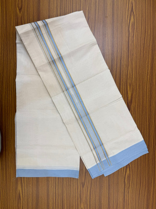 19% Discount! KaithariKada Balaramapuram 100% Cotton Off white Double Mundu/Dhoti - (100x80)s - 1.5 inch Puliyilakkara Sky Blue Stripes Chutty Gold Kasav - 139 KK5258 THI