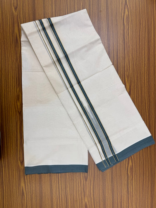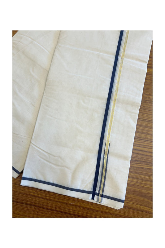 19% Discount! KaithariKada Balaramapuram 100% Cotton Off white Double Mundu/Dhoti - (100x80)s - 1.5 inch Puliyilakkara Navy Blue Green Mix Stripes Chutty Gold Kasav - 140 KK5258 THI