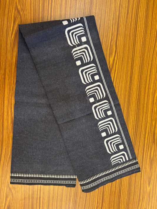 ₹239+80 (Shipping) Kaitharikada - Single Kaily / Lungi - Polyster + Cotton - 20s twisted - 2.5 inch White Design printed kara with Ash Black colour body - 116 KK8035 GAN