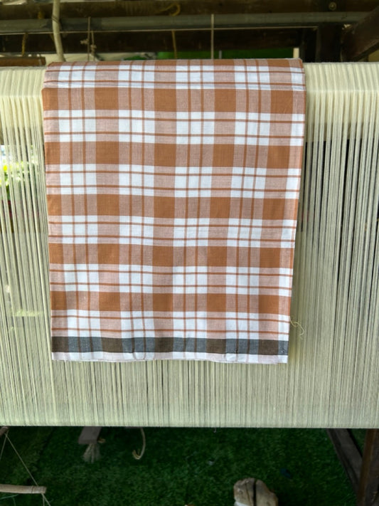 10% DISCOUNT ! KaithariKada Kalamachal 100% Pure Cotton -(80X80) Twisted Thread Handloom Single Mundu/Dhoti - Brown Check COLOUR BODY & White striped Kara- 30KK479KAL