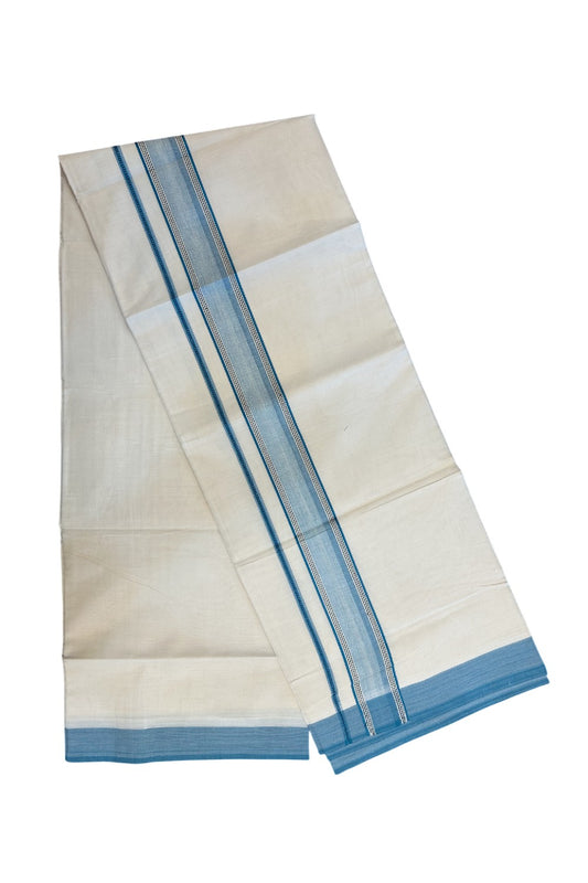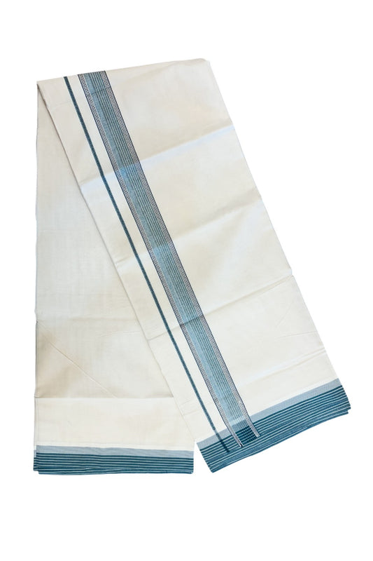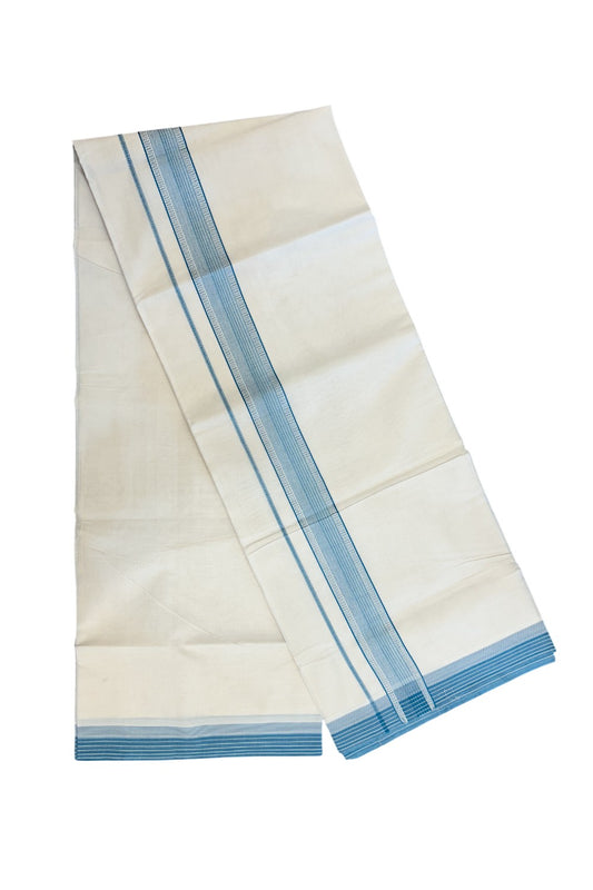 20% Discount ! KaithariKada Balaramapuram 100% Cotton Off White (Unbleached) Double Mundu/Dhoti - 100X80 - 1.5 inch Peacock Blue Stripes & Shaded Designer Kara - 16KK5213 VIN