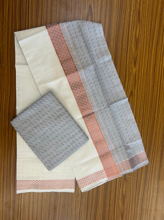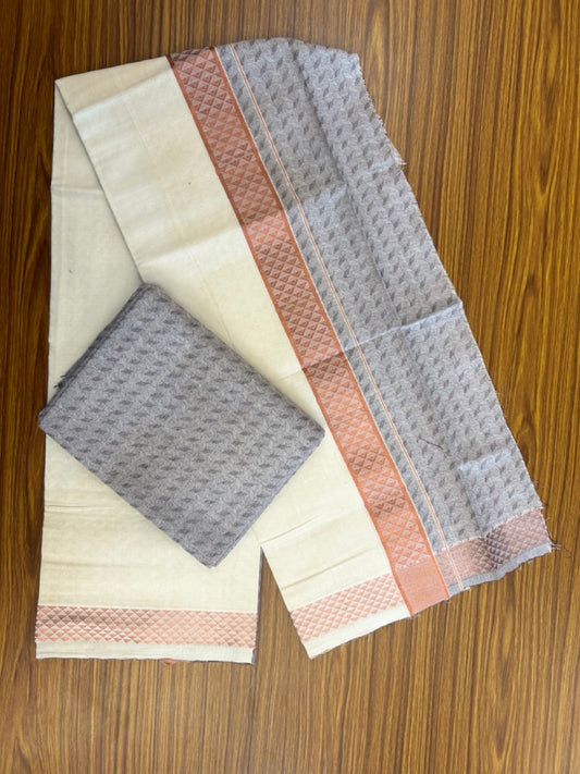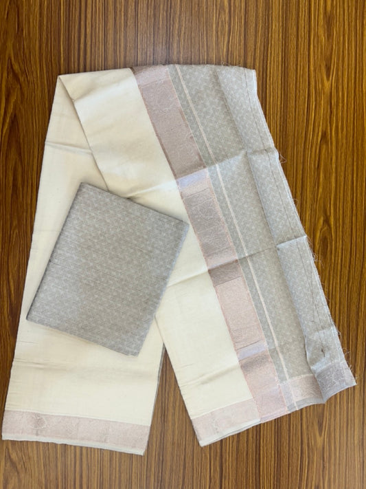 20% Discount ! Kaitharikada Balaramapuram 100% Cotton - (60)s - Single Off White Mundu/Dhoti & Shirt Material Combo - 2 inch Copper Silver Kasavu jacquard Kara with Greyish Brown shaded shirt material - 16 KK7009 THI