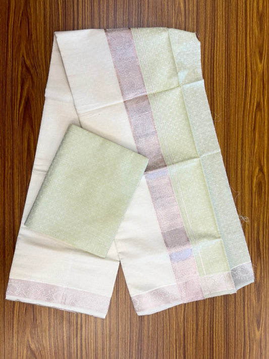 20% Discount ! Kaitharikada Balaramapuram 100% Cotton - (60)s - Single Off white Mundu/Dhoti & Shirt Material Combo - 2 inch Kasav jacquard Kara with Light Pista Green shaded shirt material - 21 KK7009 THI