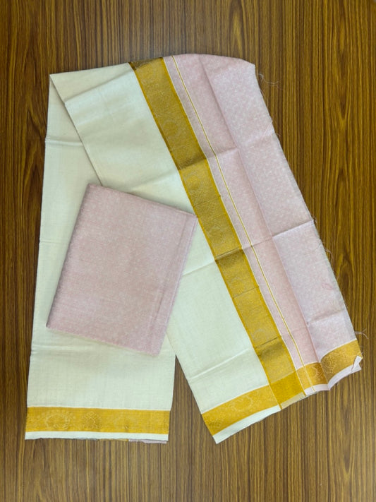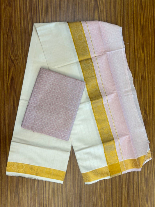 20% Discount ! Kaitharikada Balaramapuram 100% Cotton - (60)s - Single Off White Mundu/Dhoti & Shirt Material Combo - 2 inch Kasav jacquard Kara with Pink shaded shirt material - 20 KK7009 THI