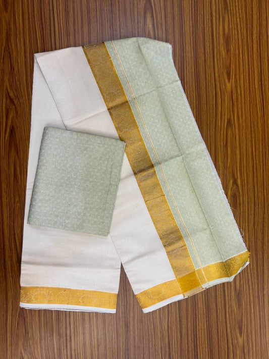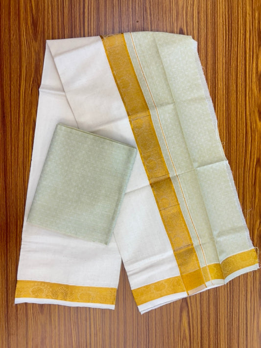 20% Discount ! KaithariKada Balaramapuram 100% Cotton - (60)s - Single Off White Mundu/Dhoti & Shirt Material Combo - 2 inch Kasavu jacquard Kara with Pista Green shaded shirt material - 19 KK7009 THI