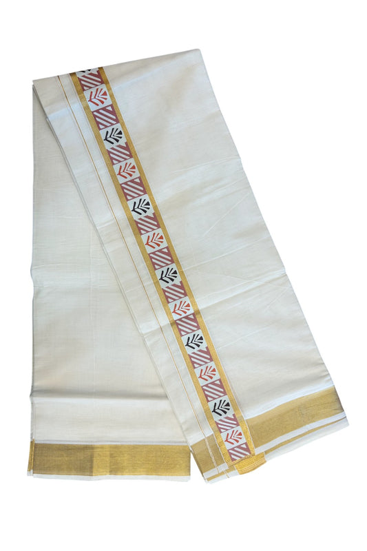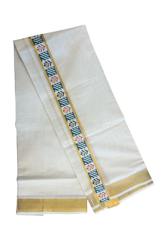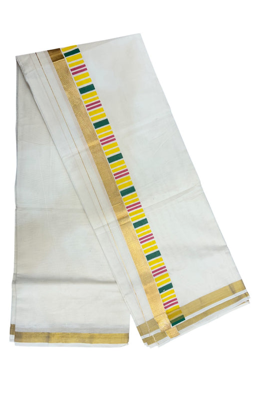 20% DISCOUNT! KaithariKada Balaramapuram 100% Cotton off white - (Unbleached) Double Mundu/Dhoti - 80X72 Cotton mix - 2 inch Printed Multicolour & Gold kasavu kara - 2KK5172PMC