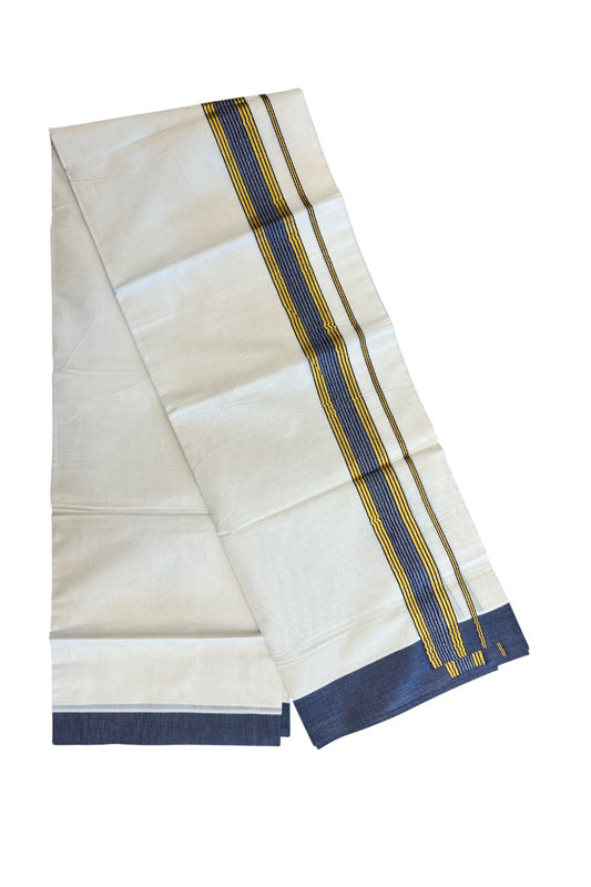 20% DISCOUNT! KaithariKada Balaramapuram Double OFF WHITE Mundu/Dhoti - 80x80- 1.5 Inch Gold Kasavu & Navy Blue Shaded striped Kara - 16KK5182VAS
