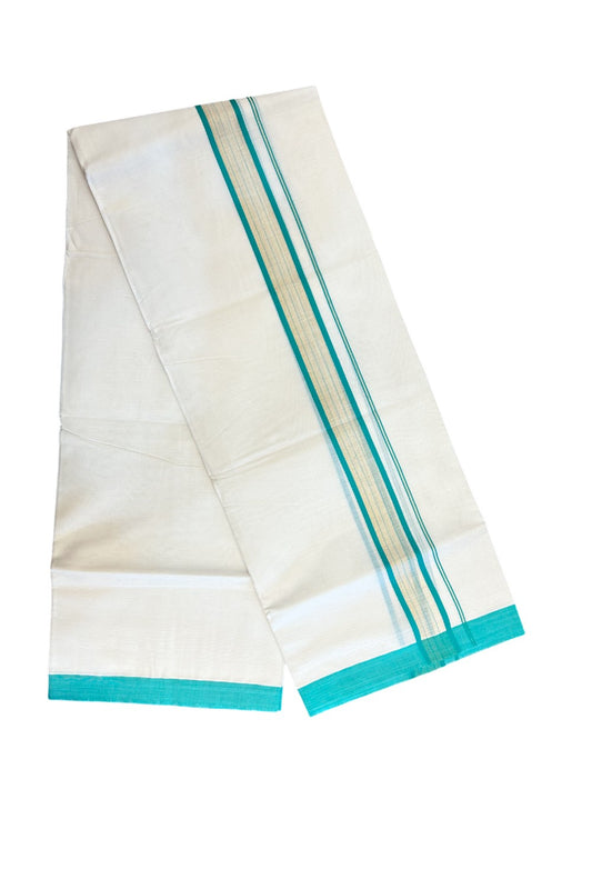 20% DISCOUNT! KaithariKada Balaramapuram Double OFF WHITE Mundu/Dhoti - 80x90 - 1.75 Inch Tissue Turquoise Green striped Kara - 7KK5182VAS