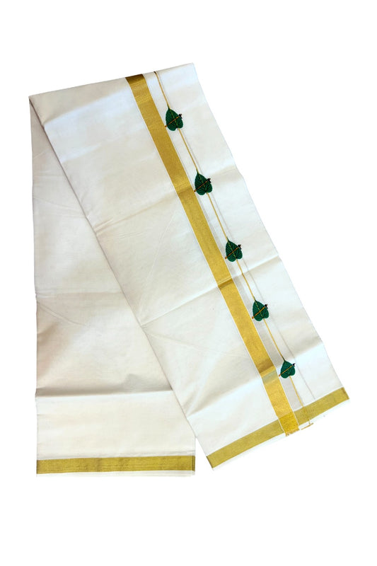 22% Discount!! KaithariKada Balaramapuram 100% Cotton Double Off White - (Unbleached) Mundu/Dhoti - 80x90 - 1 inch Gold Kasav with Green Leaf & Flute Printed Design Kara - 19KK5219 GAN