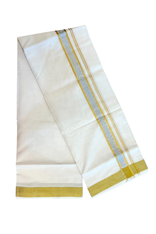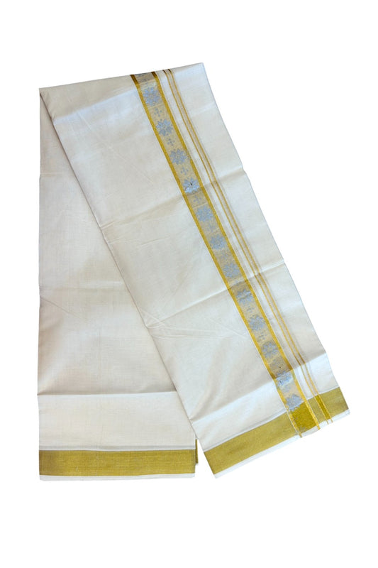 22% Discount!! KaithariKada Balaramapuram 100% Cotton Double Off White - (Unbleached) Mundu/Dhoti - 80x90 - 1.5 inch Gold Kasav with Silver Floral Printed Design Kara - 25KK5219 GAN