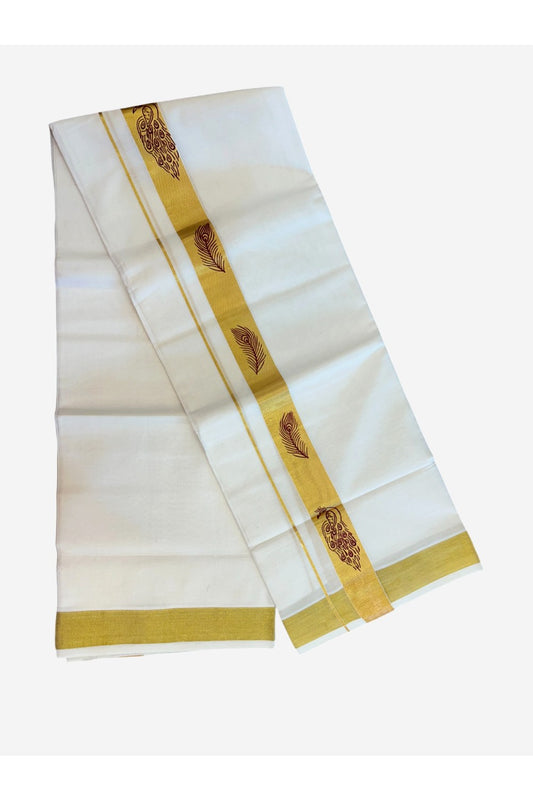 22% Discount!! KaithariKada Balaramapuram 100% Cotton Double Off White - (Unbleached) Mundu/Dhoti - 80x90 - 1.5 inch Gold Kasav with Maroon Peacock & Peacock Feather Printed Design Kara - 27KK5219 GAN