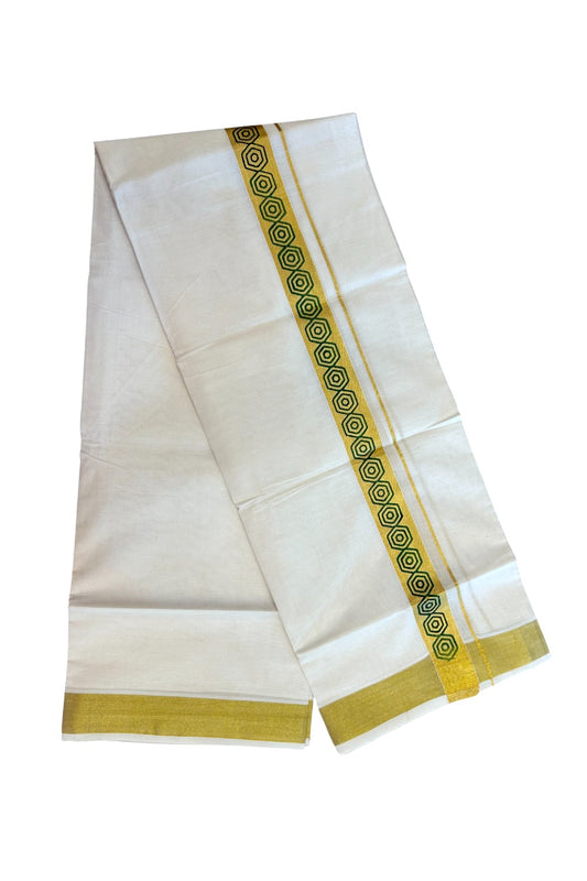 22% Discount!! KaithariKada Balaramapuram 100% Cotton Double Off White - (Unbleached) Mundu/Dhoti - 80x90 - 1.5 inch Gold Kasav with Dark Green Printed Design Kara - 22KK5219 GAN