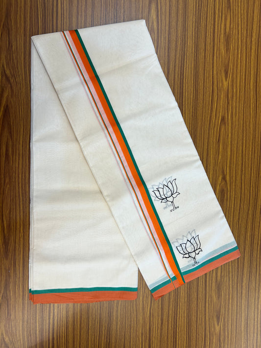 Bjp Veshti - 20% Discount! KaithariKada 100% Cotton Off White Double - (Unbleached) Mundu/Dhoti - 100X80 - 0.75 inch Hand Painted Orange & Green Lotus Design Kara - 3 KK5326 ASH