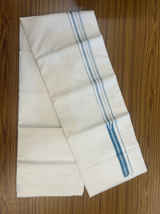 20% Discount!! KaithariKada Balaramapuram Pure Cotton Double Off White - (Unbleached) - Mundu/Dhoti - 100x80 - 1 inch Puliyilakkara Silver Kasav & Aqua Green Stripes One Side Chutty Kara 4 mtr (8.5 muzham) - 39 KK5311 VAS
