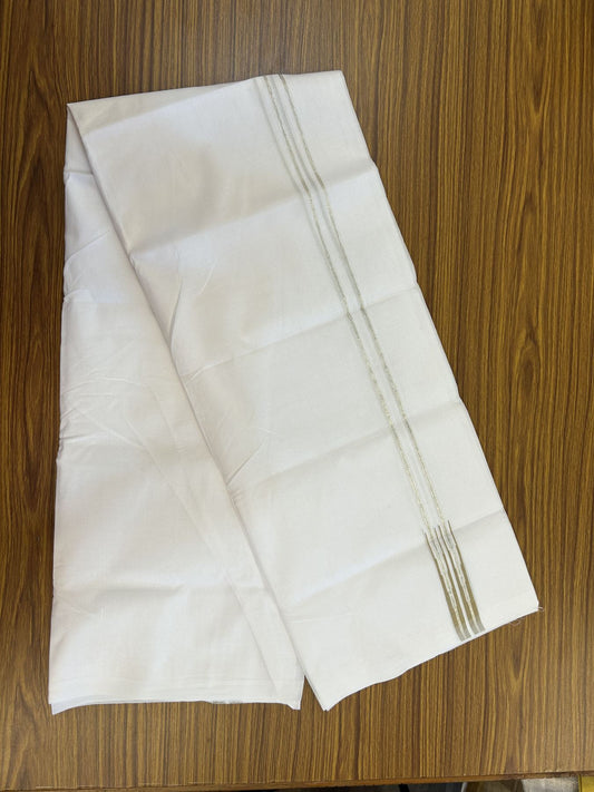 15% Discount!! Kaitharikada Balaramapuram 100% Cotton Pure White Double Mundu/Dhoti-100x90 1.5 inch Puliyilakkara chutty silver kasav & Olive green shaded kara - 61KK430VAS