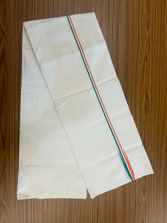 CONGRESS VESHTI - 20% DISCOUNT! KaithariKada 100% Cotton off white Double - (Unbleached) Mundu/Dhoti - 100X80 - 1.25 inch Puliyilakkara Orange White & Green Chutty Kara - 31KK5218ASH