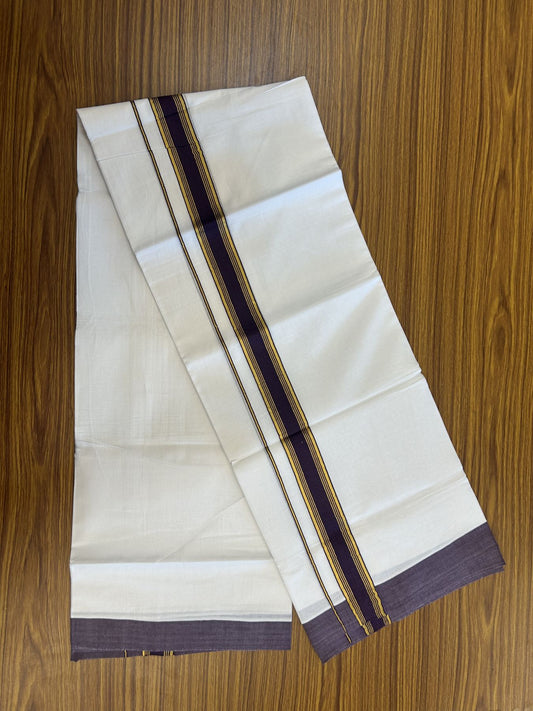 20% Discount! KaithariKada Balaramapuram 100% Cotton Double Pure white Mundu/Dhoti- 100x80 - 1.25 inch Gold Kasav & Deep Purple Stripes kara 3.75 mtr (8 muzham) - 40 KK5315 VAS