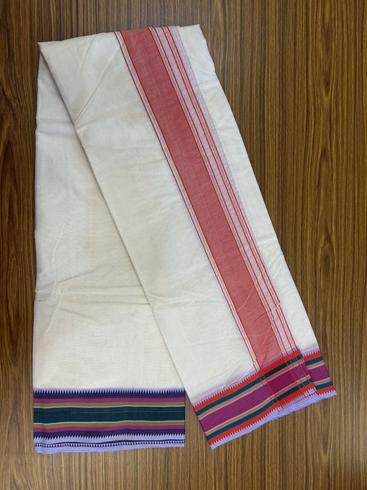 Panchakacham Dhoti - 37% Discount! Kaitharikada 100% Cotton Off White (Unbleached) - Pure Cotton - 100x100 thread - North Indian Attached Gamcha - 9X5 - Dhoti Violet Red kara with Multi colour Striped border - 21 KK5323 PMC